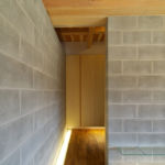 アプローチのコンクリートブロックの壁が、そのまま室内へと続いているのが特徴です。