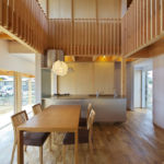 壁のない大空間とし、リビング・ダイニングに吹抜けを設ける事で、1・2階で姿が見えなくともお互いの気配を感じ取り、自然と見守り合うようになっています。