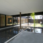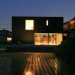 連続した水平窓と外部の螺旋階段、水盤が特徴の2世帯住宅です。